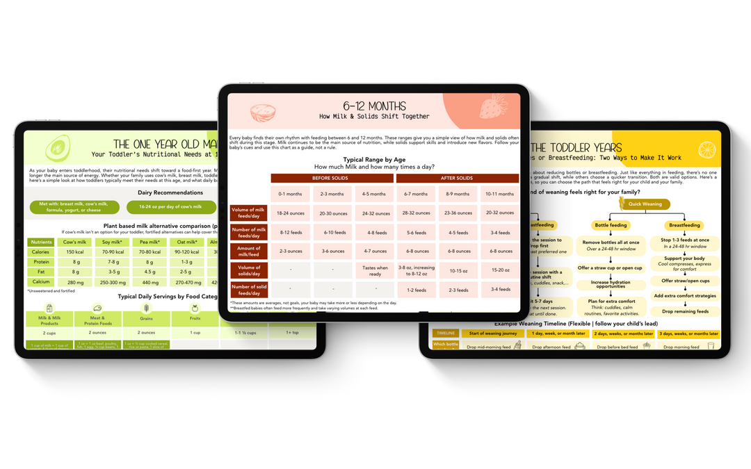 ➡️ Month-by-month: milk ↔ solids balance. ➡️ Cheat table: key nutrients + when to supplement.➡️ Sample day & ounces by age.➡️ Readiness cues & textures.
